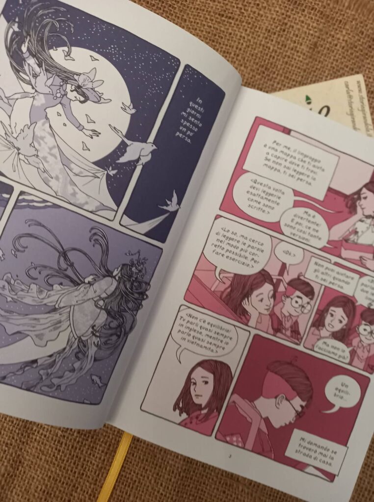 Funzionale, affascinate e narrativo l’uso del colore; il presente è disegnato in rosso, il passato in ocra e la fiaba in blu. La fusione dei colori e gli intagli narrano la complessità della storia, lo snodarsi dei rapporti famigliari e il conflitto nel quale si dibatte Tiên. Graphic Novel veramente bello, poetico e magico.